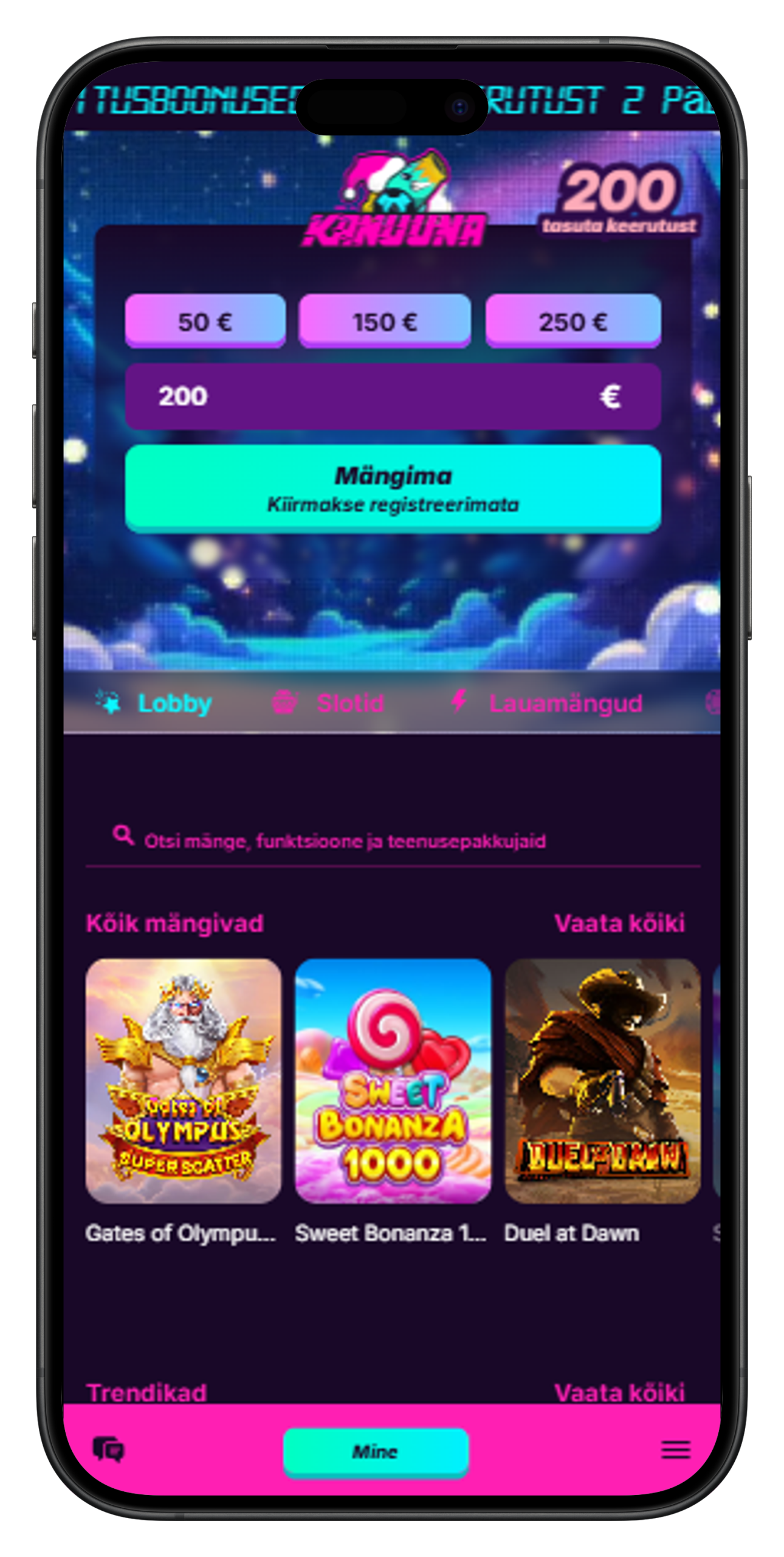 Kanuuna kasiino on justkui loodud neile, kes vihkavad ankeetide täitmist. Pay N Play on siin võtmesõna. Sa lihtsalt teed sissemakse oma Eesti pangast (Trustly abiga) ja süsteem loob sulle konto automaatselt. See tähendab, et saad kohe mängima ja võitude korral on raha pangakontol peaaegu koheselt. Kanuuna pakub tipptasemel mänge parimatelt tootjatelt ja mis kõige olulisem – neil on Eestis litsents, nii et võid olla kindel, et kõik on aus ja turvaline.